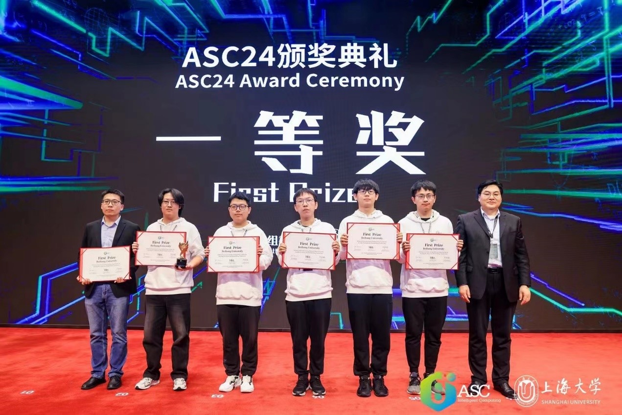 ASC24超算大赛历时近六个月,全球共有300余支高校代表队报名参加,经过预赛选拔出的25支队伍成功晋级在上海大学举行的总决赛,现场决赛队伍数量也创下历年之最。决赛要求各参赛队伍在3000瓦功耗约束下设计安装小型超算集群,运行优化国际通行基准测试HPL&HPCG、大模型推理优化、渗流数值模拟、火星大气模拟、新型材料结构计算等前沿科学与工程应用,并参加英文答辩。北航超算队克服学业压力连续奋战数个月优化赛题,在总决赛中沉着应对,最终斩获一等奖的优异成绩,这也是北航超算队第8次在世界超算竞赛中获得一等奖;并且本年度在新型材料非平庸电子结构计算赛题上表现优异,获得应用创新奖。