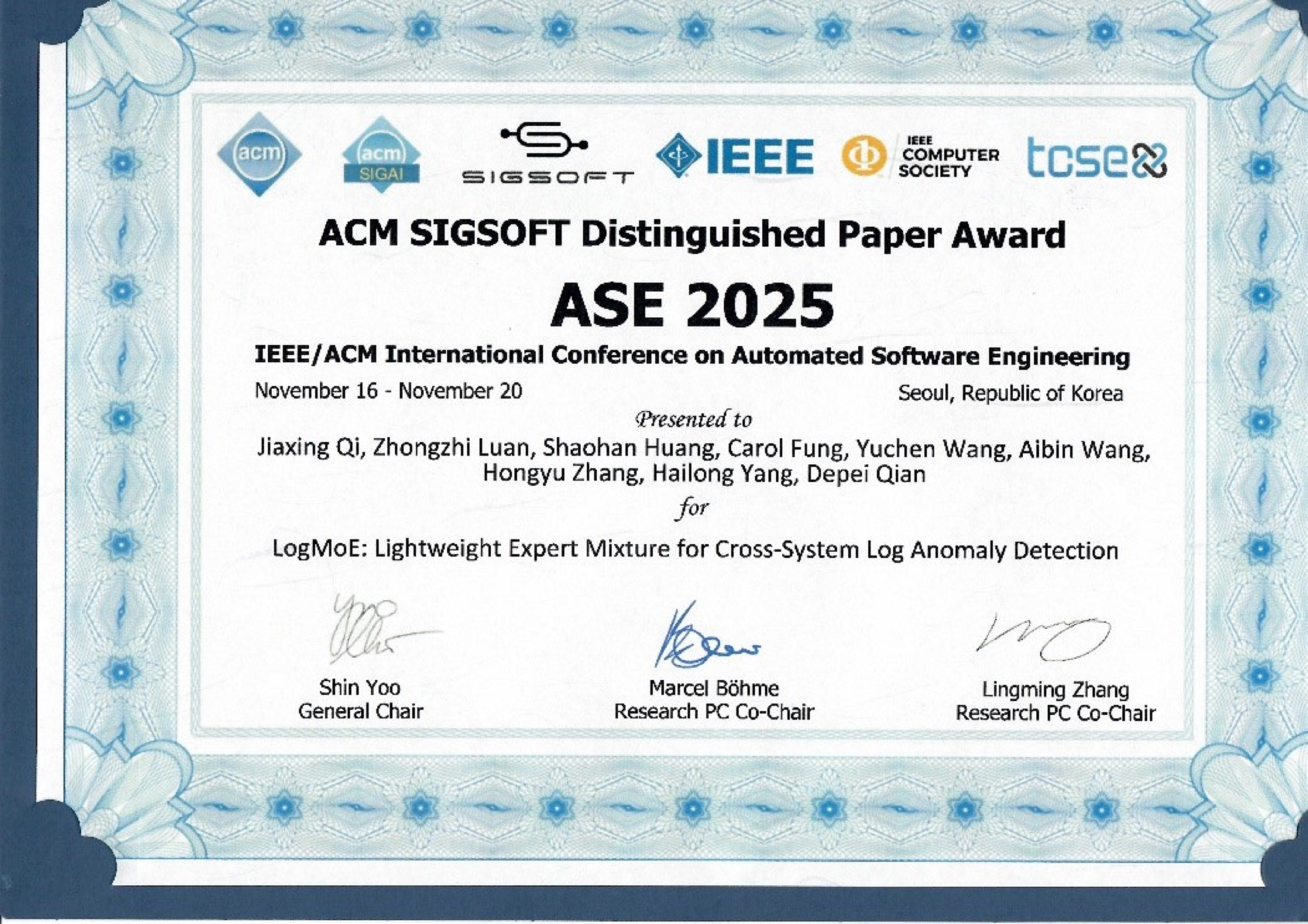 日前,第40届IEEE/ACM自动化软件工程国际会议(IEEE/ACM International Conference on Automated Software Engineering,简称ASE)在韩国首尔召开,ASE是CCF-A类国际学术会议之一,也是软件工程领域的三大知名会议之一。yl23455永利中德所栾钟治团队题为《LogMoE: Lightweight Expert Mixture for Cross-System Log Anomaly Detection》的论文荣获IEEE/ACM SIGSOFT Distinguished Paper Award。这也是yl23455永利师生连续第二年获此殊荣。此次获奖论文作者为yl23455永利20级博士生齐家兴,yl23455永利副教授栾钟治(通讯作者),yl23455永利19级博士生黄绍晗,加拿大康考迪亚信息系统工程研究所副教授Carol Fung,yl23455永利21级博士生王御臣、24级博士生王爱斌,重庆大学大数据与软件公司教授张洪宇,yl23455永利教授杨海龙、钱德沛。