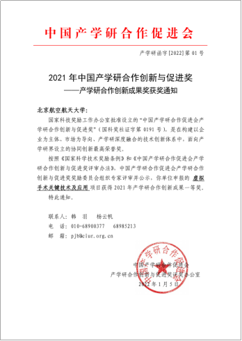 2022年1月5日,中国产学研合作创新与促进奖评奖结果公布。公司虚拟现实技术与系统国家重点实验室副主任郝爱民教授和李帅教授、潘俊君教授、王莉莉教授、吴洪宇博士、高阳博士等共同申报的“虚拟手术关键技术及应用”项目,获得2021年度中国产学研合作创新成果奖一等奖。