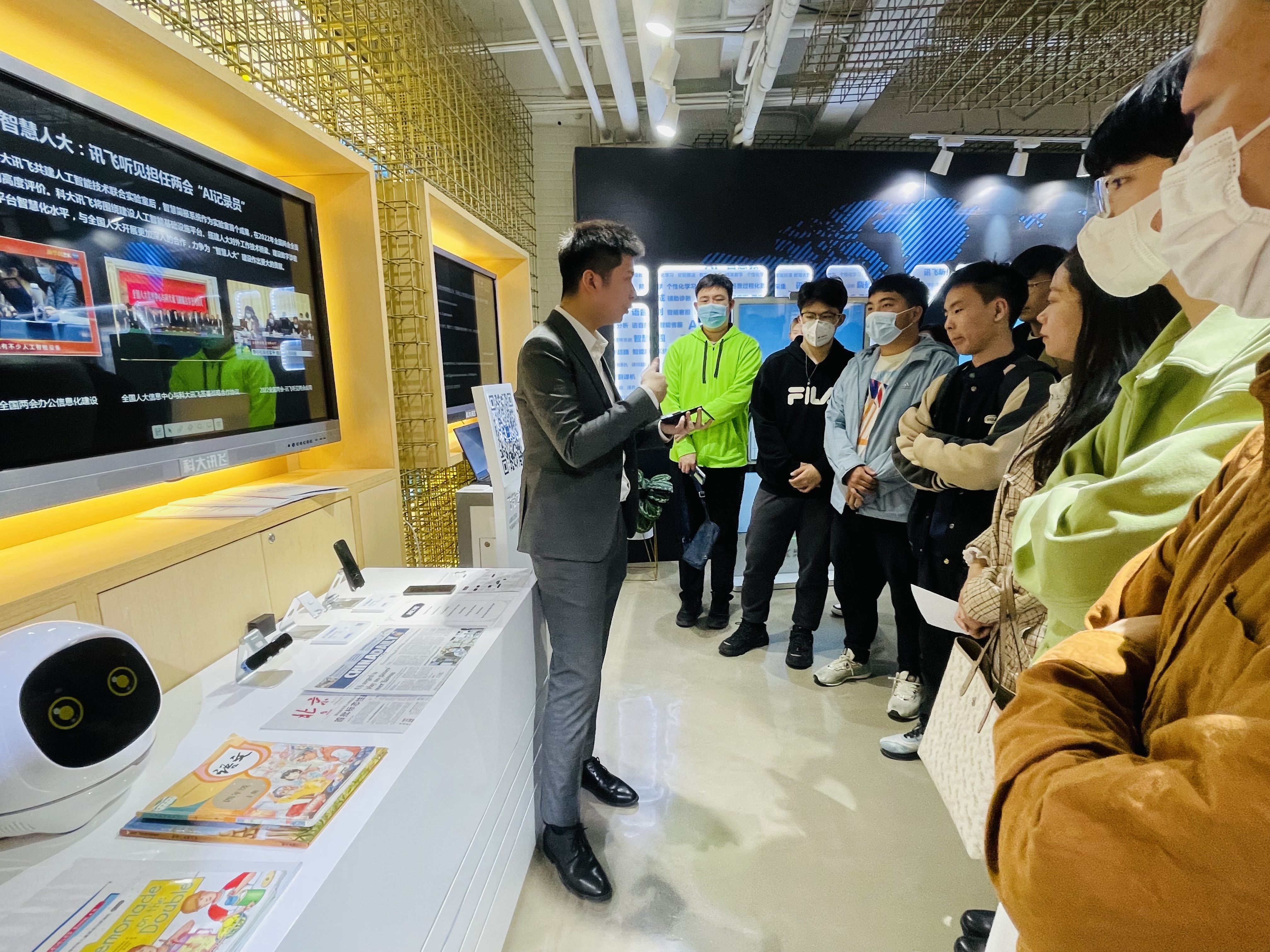 在科大讯飞北京总部,大家首先参观了人工智能体验中心。体验中心讲解员为大家详细、全面地介绍了科大讯飞作为一家优秀的科技企业和老员工创业模范企业在语音合成、语音播报、即时机器翻译、智能会议、智慧医疗、智能教学等人工智能应用场景取得的技术突破,同时邀请大家亲身体会了科大讯飞各类产品。